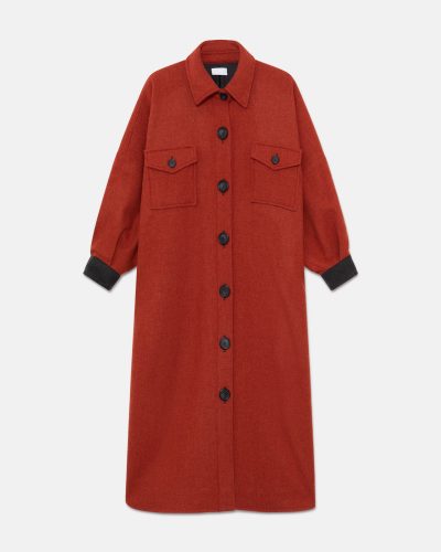 590,00 €El precio original era: 590,00 €.290,00 €El precio actual es: 290,00 €.Esta versión del abrigo Carmen en mezcla de lana y algodón es una de las opciones más calentitas de la colección. Con un patrón oversize, el abrigo Carmen recuerda a una camisa de toda la vida. Su cuello y sus puños en gris marengo contrastan con el rojo teja del cuerpo.